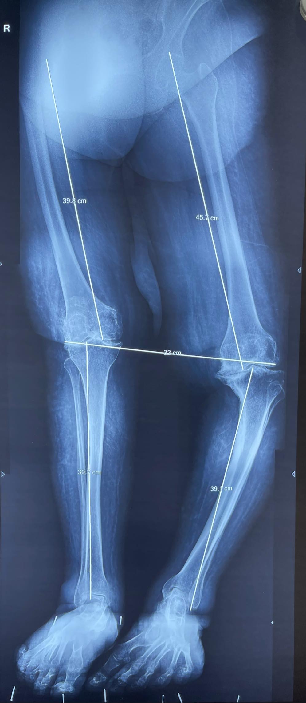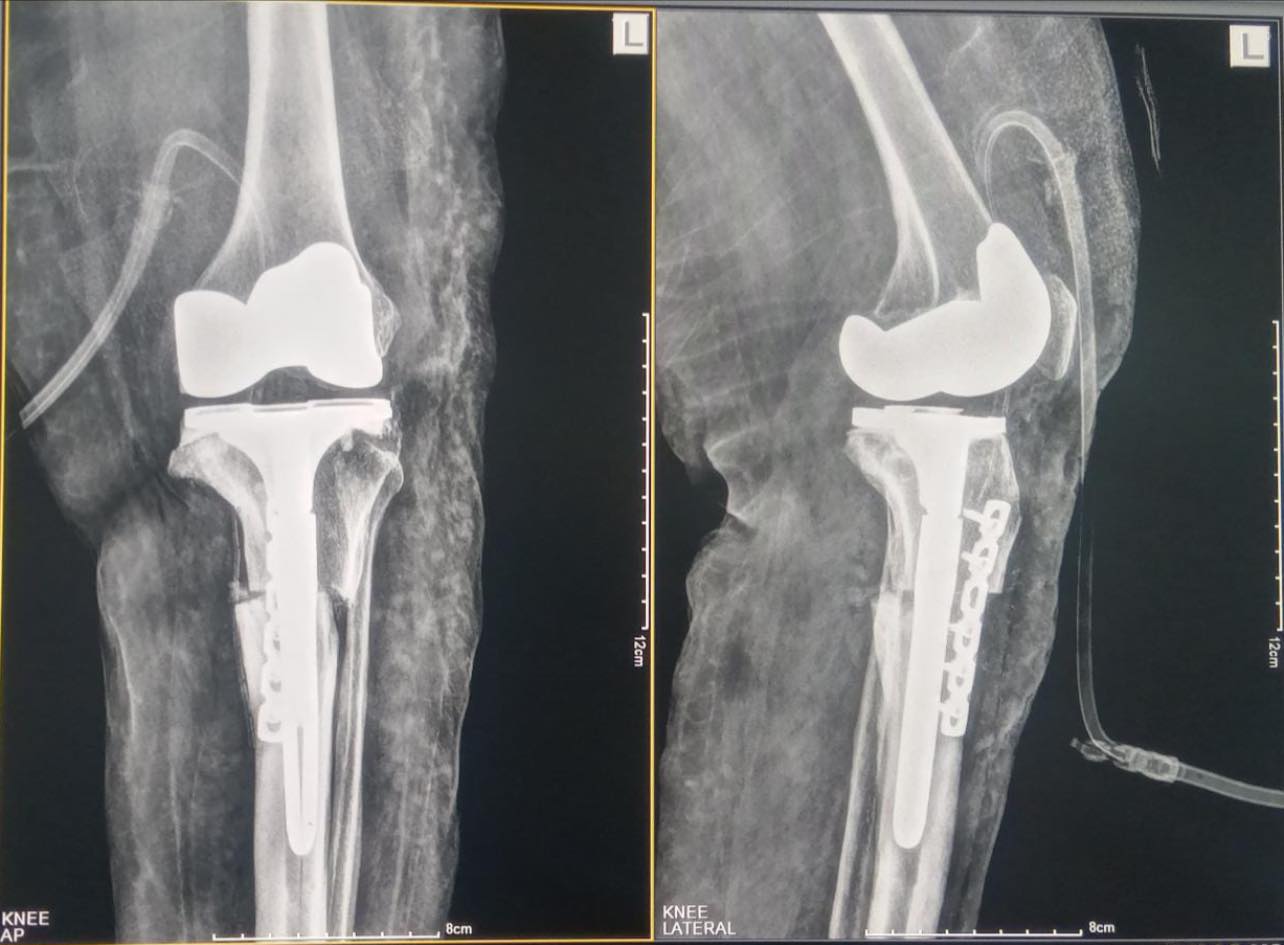 A 57-year-old female with ol malunited tibial plateau fracture and OA knee. In such cases just replacing the knee joint will not suffice as the deformed leg will cause continued pain and eventual failure of the surgery. The osteotomy straightens the leg deformity which is stabilized with this long stem prosthesis and outside recon plate.